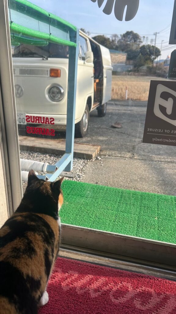 そして今朝。波打ち際徘徊です。サンダルから長靴履いて、レッツゴーです。心配そうに見つめるニャーさん。