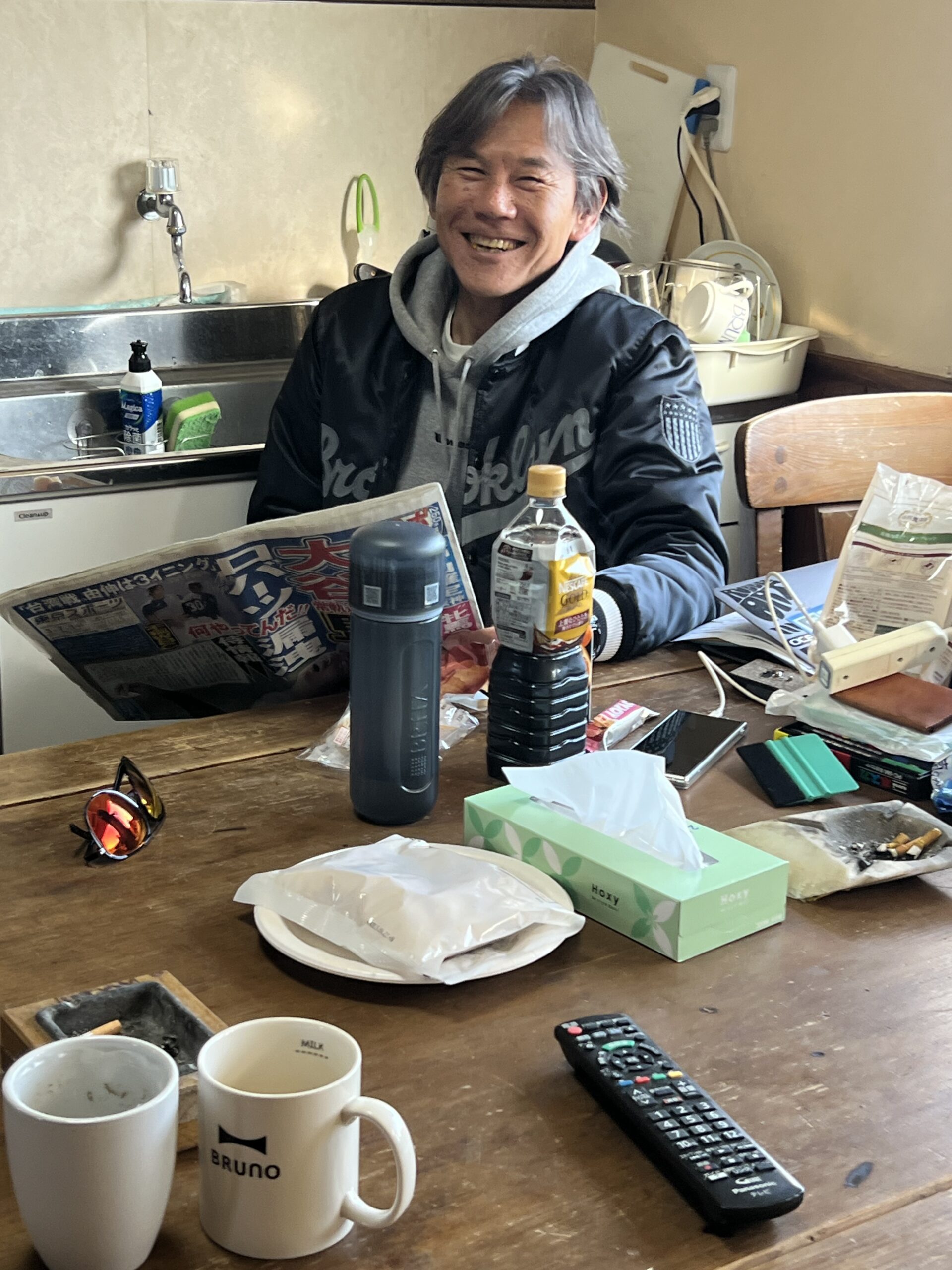夜半の大雨は上がり良い天気。ですが、海はクローズ、強い南西風。人出もまばら。ブイチ君、ケンタロー、新潟オニ君が顔を出す。そして、毎週末朝8時半の男🔥。
