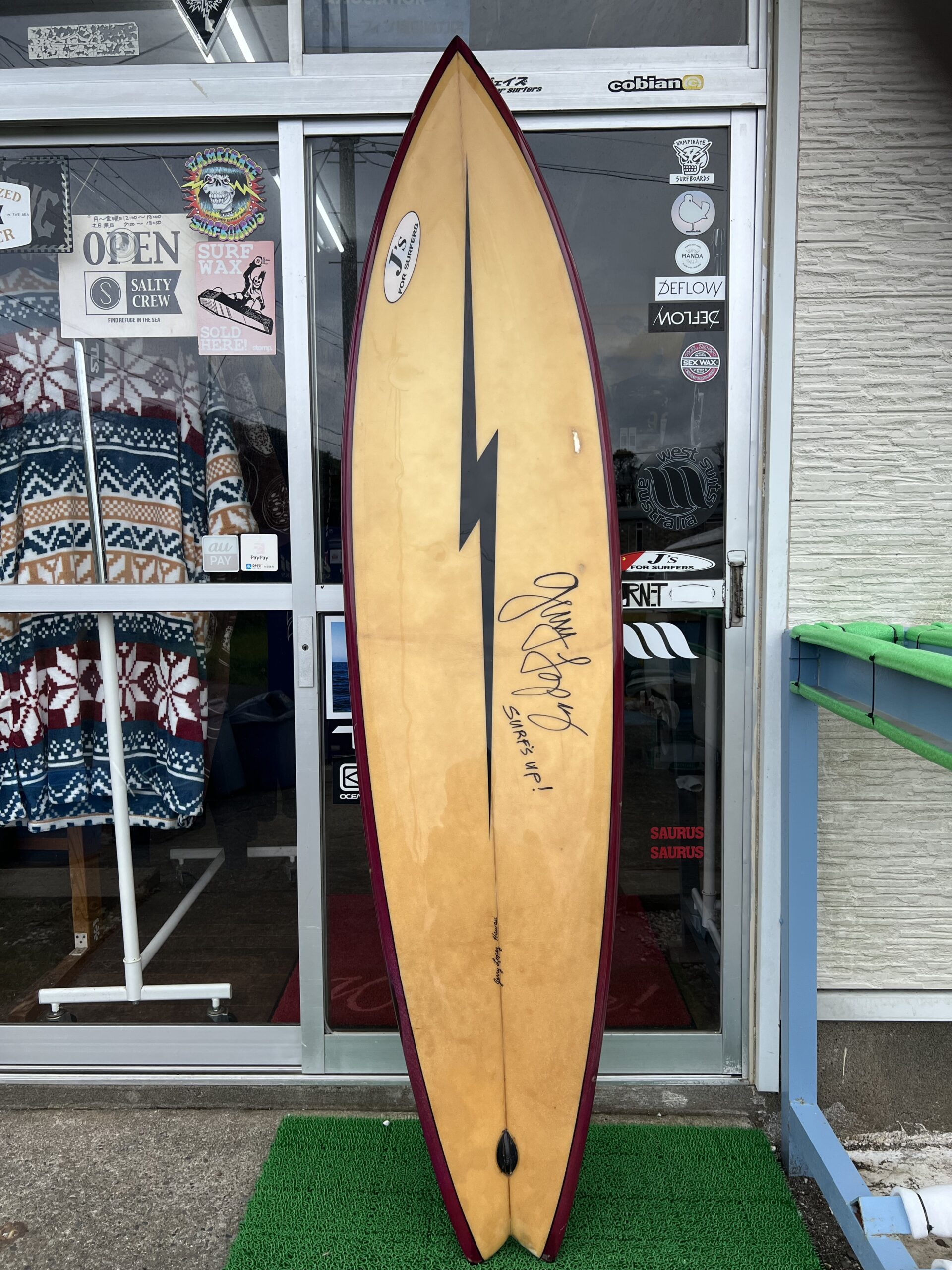 以前、J’Sへ来たことがあるという外人さんからメールあり。「ショップに飾ってあるライトニングボルトが欲しいのですが、譲っていただけないですか?」大概この手の商談は上手くいった試しがないから「US5000💲なら考えても良いよ!」と返信しておいた。「次回見に行かせてください。よろしくお願いします。」万が一、商談成立したらまたアップします。あんまり売る気も手放す気もないし、どっちでもいいんだけど。とりあえず、こういうビンテージ物を好むサーファーは海外に圧倒的に多くて、日本には、こういうものに興味ある人は少ない。歴史や文化、サーフィンにおける総合的教養の格差なんだろうけど、あはは。