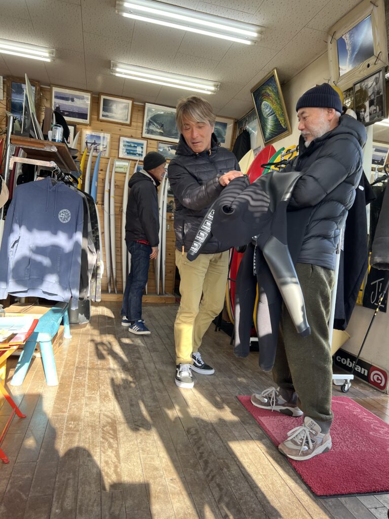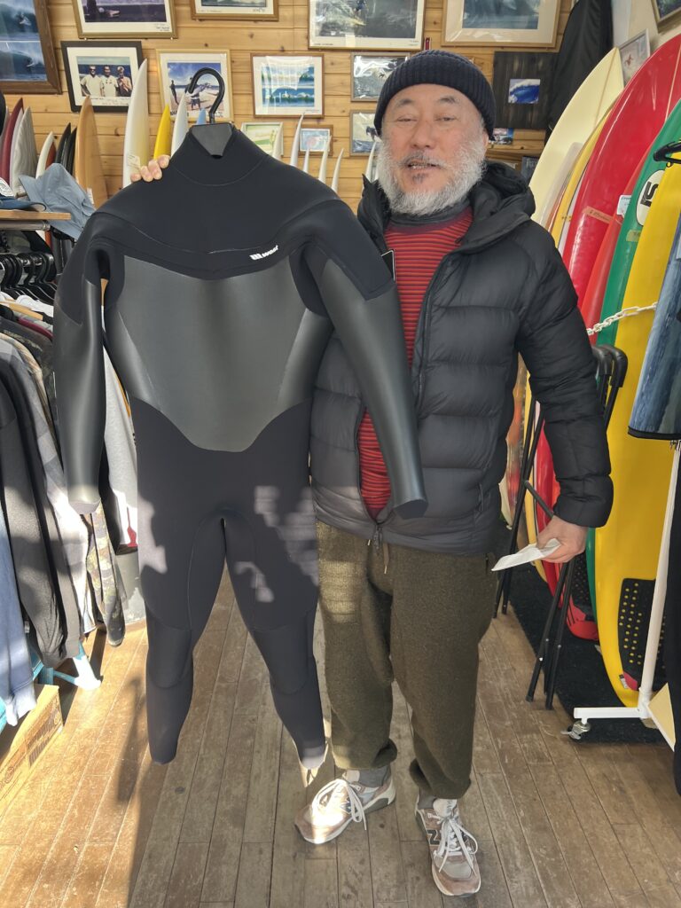 新しいウエットが出来上がったコンドー。大学時代からの友人、長い付き合い。コンドーは付属からヌルっと進学、オレは一年くさい飯(刑務所じゃなくて予備校な!)喰ったから、歳はオレがひとつ上になるけど、もはやそんなこと気にする歳でもない!