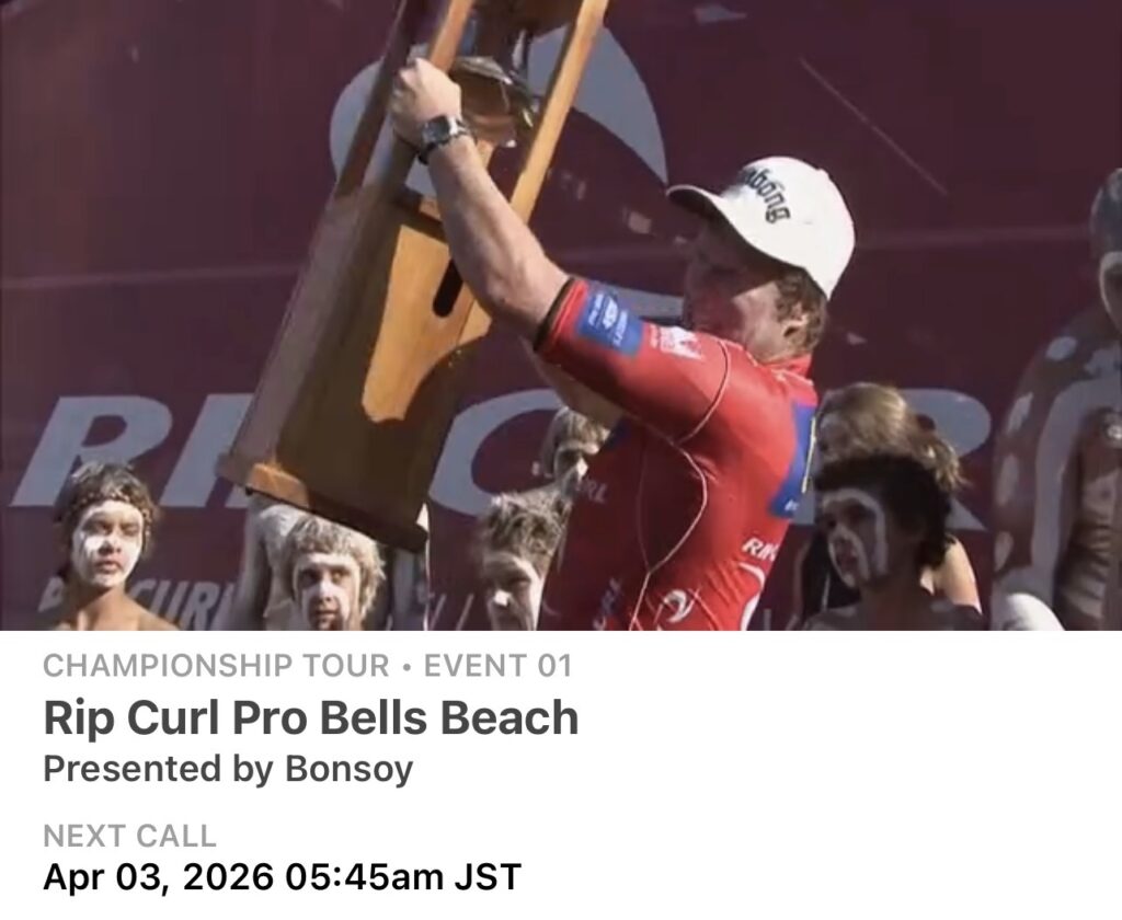 今日スタート予定のベルズビーチ、CTコンテストは4/3の新しいスウェルを待ってスタートするらしいです。てことはウィンキーじゃなくてベルズでやるってことなんだな、ふむふむ🤨、、、
